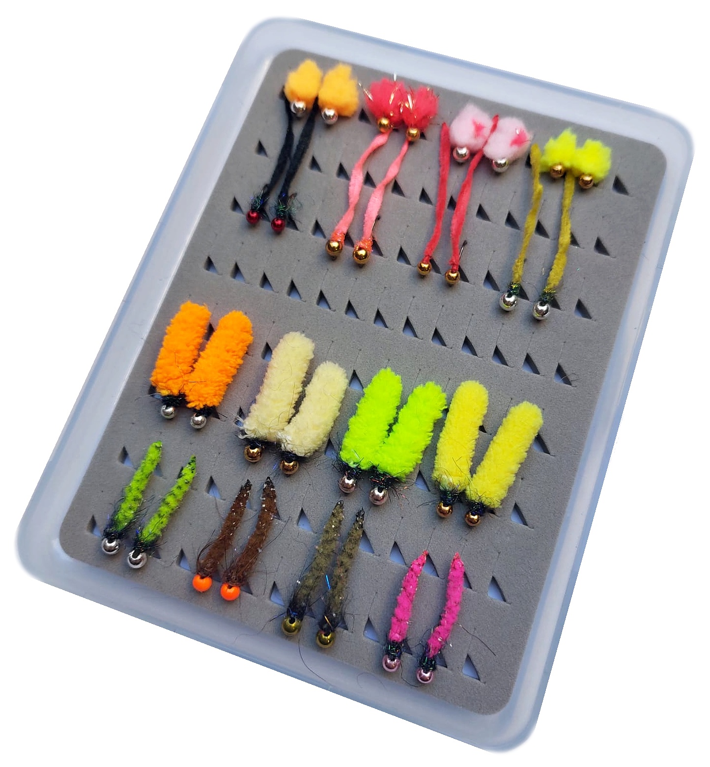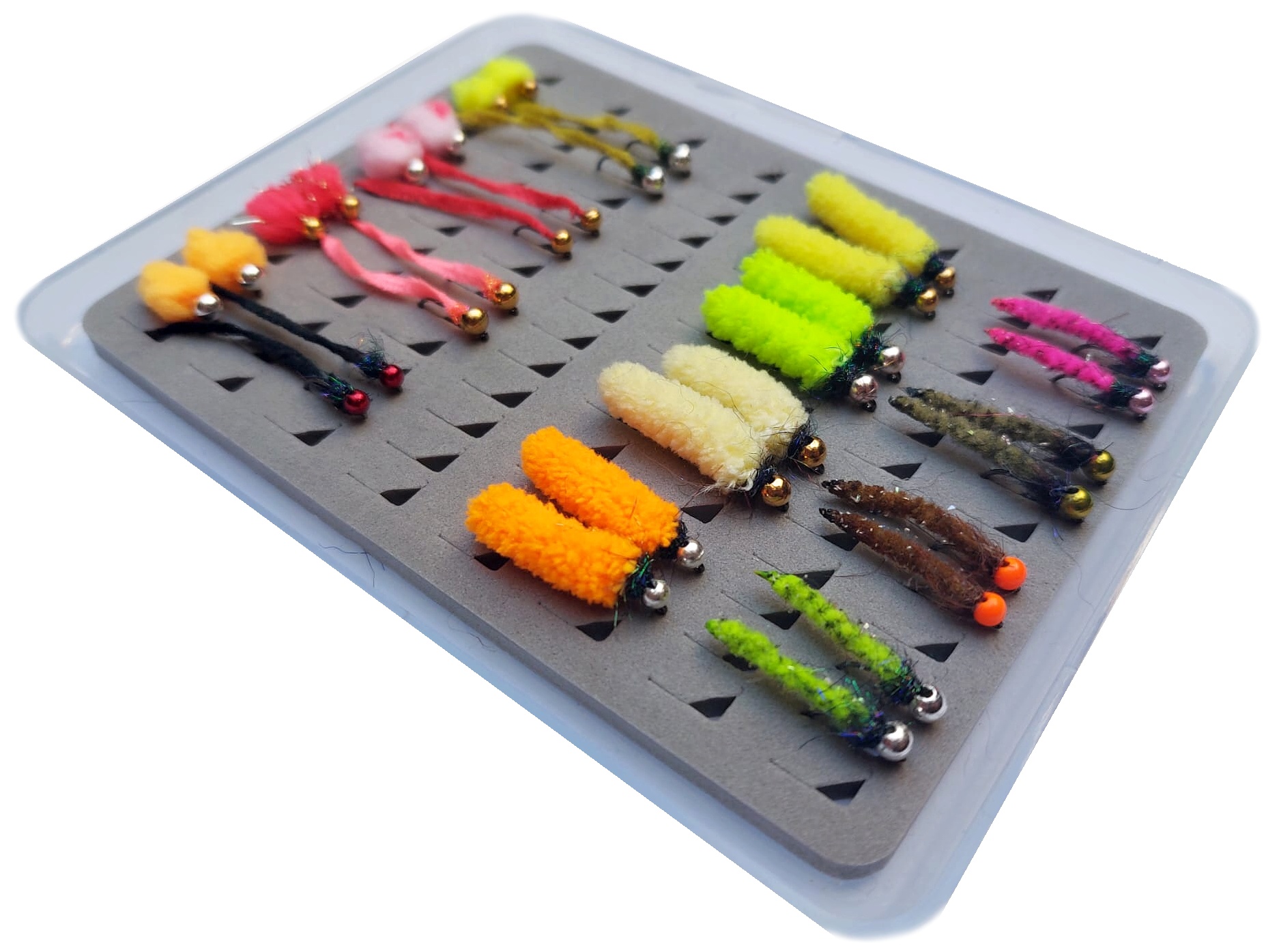 V setu najdete 4 barevné varianty jiker - Egg Flies, 4 druhy červíků - Wormů z jemných barevných šenylek, 4 velké vzory pestrobarevných MOP Flies a další 4 vzory menších MOPů s tělíčky z jemnějších šenylek. Všechny "mušky" jsou zatížené tungstenovými korálky a jsou tedy určeny hlavně pro lov nymfovacími technikami, případně při jezerním lovu metodou BUNG.