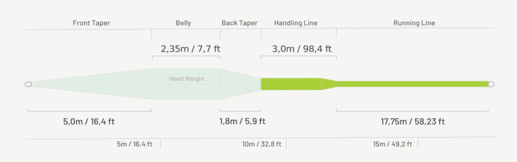 Muškařská šňůra Bullet+ má délku hlavy 9,25 m / 30 ft a celkovou délku 30 m / 98 ft, a je ideálně přizpůsobena pro práci na střední až delší vzdálenosti.