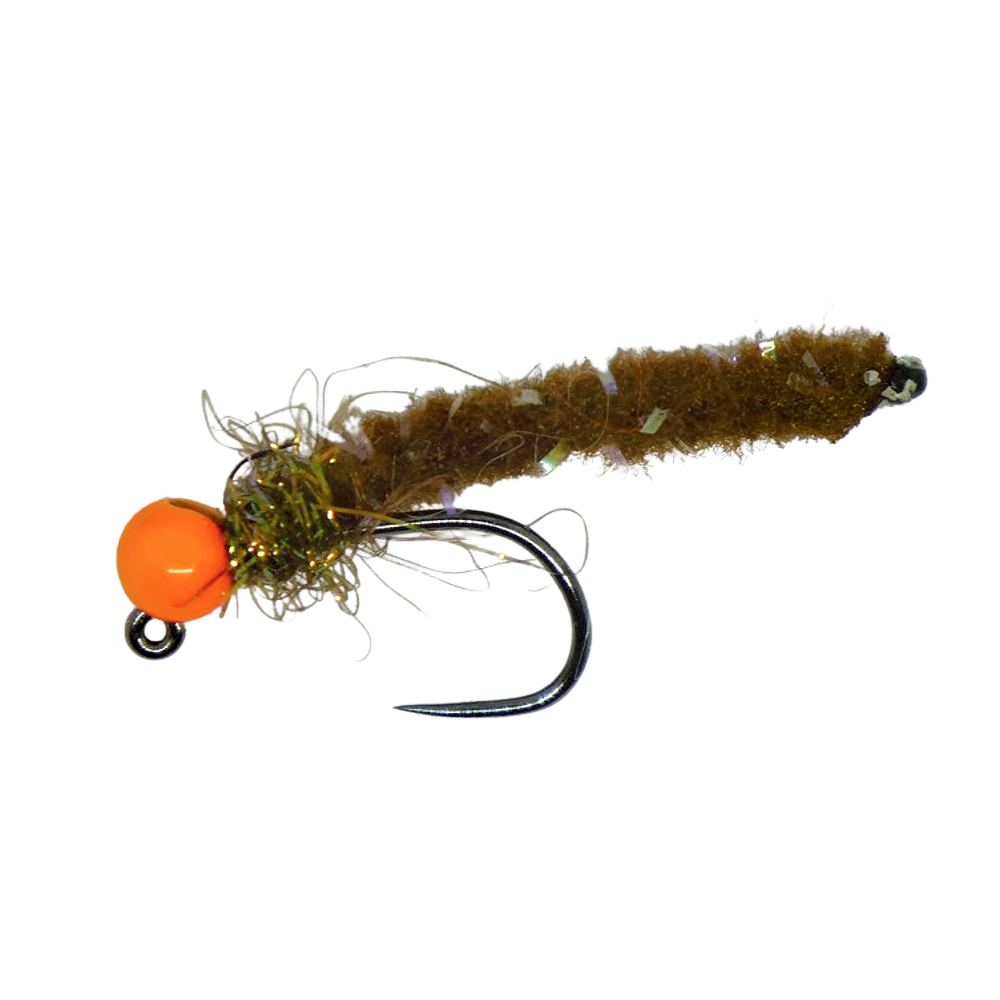 Tungstenový jig MOP Fly s hnědým tělíčkem a fluo oranžovou hlavičkou